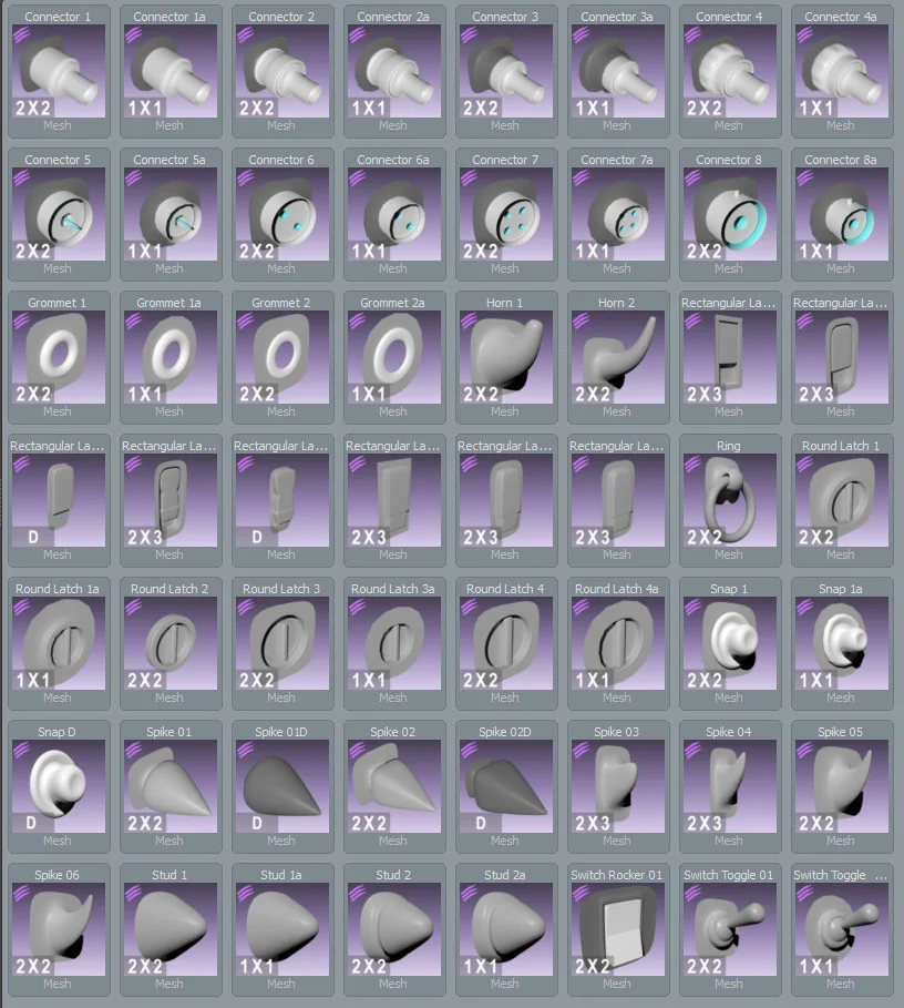 This Add-on to the Polystein Kit is a collection of 56 Sub-D kit-bash presets. These presets are perfect for adding detail to clothing or armor from sci-fi to fantasy. Need studs on your armor, snaps on your jeans, latch for your sci-fi suit or want to add some details to your electronics then this is a set for you.